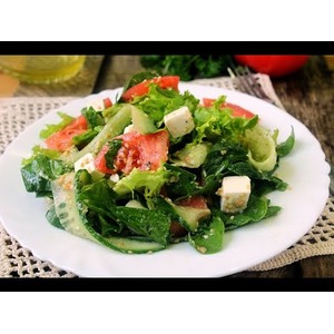 Описание: Этот салат очень легкий и вкусный! Свежие овощи, зелень, сыр, семечки кунжута с заправкой из оливкового масла.