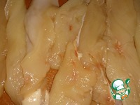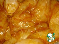 Замариновать в этом соусе полосочки куриного филе. Оставить мясо в маринаде на пару часов. |