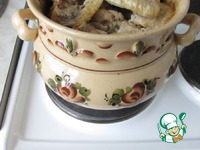 С верху картошки выкладываем нашу подготовленную курочку. Отправляем в холодную духовку и включаем 200 градусов на примерно на один час. |