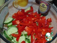 Пока шашлык готовится, делаем на гарнир салат по мотивам греческого. Огурцы порезать крупными полукольцами. |