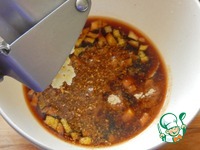 В соево-лимонную смесь добавляем все приправы, пропущенный через пресс чеснок, и мелко порезанный зеленый лук. |