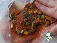 Филе моем просушиваем, выкладываем в пакет или на большой кусок фольги, натираем маринадом и плотно заворачиваем оставляем на 1 час. |