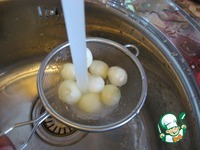 Мелкий лук, очистить, ошпарить кипятком и тут же промыть под струей холодной воды |