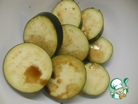 Баклажан нарезаем кольцами толщиной по 1 см. Сало режем крупными пластинами. |