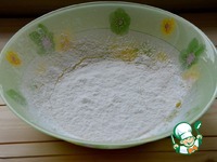 В желтковую массу всыпать 2 ст. л. просеянной муки, аккуратно размешать венчиком |