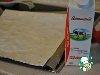 Смазываем маслом пергамент для выпечки, кладём на него лаваш, 1 лист. На него выкладываем начинку, распределяем ложечкой. Уголки лаваша мажем кефиром. |