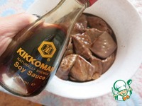 За полчаса до готовки слить молоко и залить печень соевым соусом. |