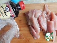 Грудку моем и нарезаем на небольшие полоски. |