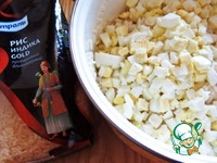 Яйца нужно заранее отварить, остудить и нарезать кубиками. Добавляем яйца в готовую, горячую рисовую кашу. |