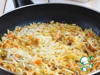 На оливковом масле с добавлением сливочного обжарить мелко нарезанный репчатый лук, добавить натертую морковь и мелко нарезанные грибы. |