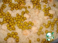 Перед окончанием добавим горошек, перемешаем, одну минуту прогрем и выключаем. |