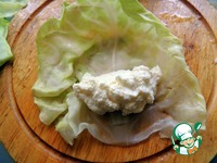 Срезать с листьев толстые прожилки. Положить по 1 ст. л. начинки и завернуть голубцы. |