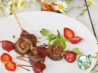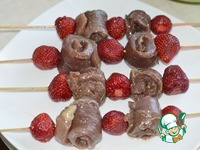 2. Клубнику вымыть, обсушить. На шпажки надеть клубнику, затем полоску грудки, свернутую рулетом, снова клубнику и т. д. |