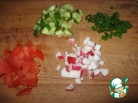 Овощи нарезаем кубиком, шинкуем зеленый лук |