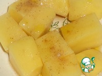 Добавляем к картофелю соевый соус и оливковое масло. Добавляем черный и красный перец по вкусу. |