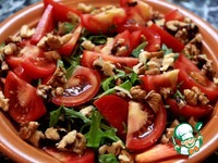 Описание: Салат "Благодатный". С удовольствием делюсь с Вами диетическим, полезным и вкусным салатиком с печенью, помидорами, орешками и рукколой. Для тех, кто следит за своим весом, диетологи даже разработали «печеночную» диету, позволяющую за 2 недели сбросить 6-8 кг. Однако больше двух недель проводить печеночную диету не рекомендуется. Калорийность говяжьей печени легко запомнить – 100 килокалорий на 100 грамм. Содержащийся в ней тиамин оптимизирует процессы головного мозга и в значительной степени нейтрализует губительное влияние алкоголя и табака. Всем известна польза говяжьей печени и в борьбе с дефицитом железа. Сто грамм отварной говяжьей печени компенсируют суточную потребность в витаминах. Приготовьте и насладитесь великолепным вкусом блюда!