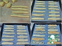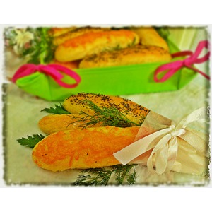 Тесто скатать в жгутик и разрезать на небольшие кусочки, у меня их получилось 14шт. Каждый кусочек скатать в жгутик длиной ~15-17см. Уложить на противень, застеленный пергаментной бумагой и поставить в тепло на 20 минут. Затем каждую палочку обмазать яйцом (+0,25ч. л. сахара для более румяной корочки) и на свой вкус обсыпать палочки. Я для примера присыпала маком, сыром и оставила просто без присыпки. Здесь уже фантазируйте и смотрите, что у Вас есть под рукой. Выпекаем в заранее разогретой духовке 25-30 минут при температуре 180 градусов, ориентируйтесь по своей духовке. |