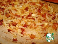Займемся начинкой: бекон нарежем небольшими кубиками и на сковородке обжарим. Как только жир начнет выделяться, добавим лук, нарезанный тонкими полукольцами. |