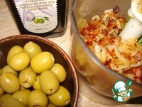 В чашу блендера добавим оливки, петрушку и обжаренный лук с беконом. |