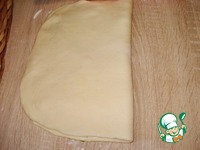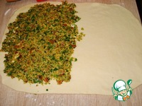 Подошедшее тесто раскатать в прямоугольник примерно 30х15. На половину теста выложим начинку. |