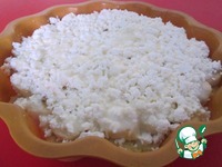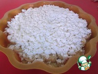 Теперь ровненько посыпаем сверху творогом. У меня домашний. Делала и с магазинным, тоже вкусно! Чуть-чуть приминаем сверху лопаткой или ложкой, выравнивая поверхность. |