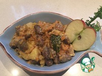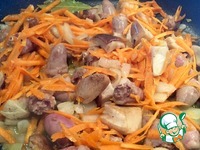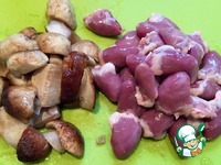 Нарежьте и поджарьте лук, всыпьте грибы и сердечки. |