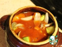 На дно горшочка положить чеснок, нарезанный пластинками. Затем выложить половину овощей, нут (отваренный согласно инструкции на упаковке) и оставшиеся овощи. |