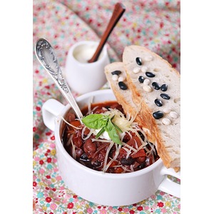 Овощи обжариваем пару минут вместе с тимьяном и ромарином, за тем добавляем фасоль и вино, перемешиваем и выпариваем на среднем огне. |
