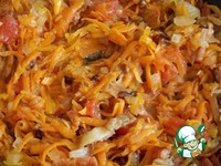 Добавить тертую морковь и порезанный лук. Поджарить их 3 мин. Положить резанный чеснок и томаты. Прогреть еще 1-2 мин. |