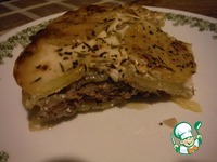 Моем и чистим картошку, режем тонкими ломтиками и больше не моем, чтобы остался крахмал и запеканка лучше застыла. Фарш перемешиваем с луком, перцем, солью. В форму наливаем пару ложек сливок и выкладываем слой картофельных ломтиков с нахлёстом, веером (используем половину порезанной картошки). Солим, поливаем на картошку ещё пару ложек сливок, выкладываем фарш, разравниваем. Сверху выкладываем оставшуюся картошку, солим, поливаем оставшимися сливками, посыпаем перчиком и зеленью для красоты.