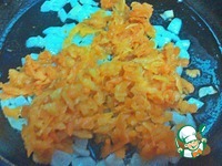 Оставшийся лук (1 шт) мелко порезать и поджарить на небольшом колличестве растительного масла, затем добавить морковку и прижарить еще 2 минутки. |