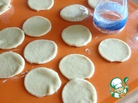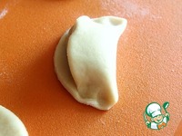 Перегибаем кружок теста пополам и пальчиками придавливаем тесто по краям, оставляя верхнюю часть открытой. |