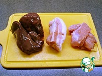 Печень освобождаем от плёнок, жира и сосудов. Все мясопродукты - печень, грудинку, свиную лопатку - режем на небольшие кусочки. |