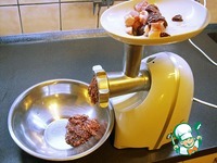 Мясо, печень и лук проворачиваем на мясорубке, используя мелкую паштетную решётку. Паштет получится нежнее, если проворачивать два раза. |