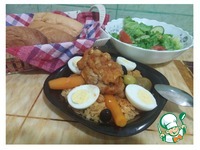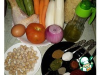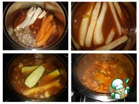 Окорок режем пополам, лук и помидор мелким кубиком, кабачок вдоль на 2 части, редис вдоль на 4 части, морковь я не резала, она у меня мелкая. В кастрюле разогреваем 3 ст. л. подсолнечного масла и обжариваем до румяной корочки окорок. Добавляем лук и пропущенный через пресс чеснок. обжариваем до прозрачности лука, добавляем помидор и жарим пока тот не разойдется. В чашке смешиваем черный перец, соль, сахар, кумин, что-нибудь острое, томатную пасту, добавляем воду, перемешиваем и выливаем к овощам в кастрюлю. Даем по млеть... |