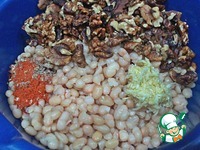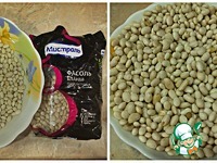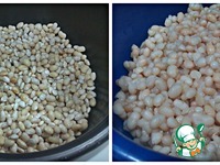 Фасоль промойте, залейте водой и поставте в холодильник на ночь. Вот так фасоль набухнет. Можно использовать красную фасоль, тогда цвет рулета будет более ярким. |