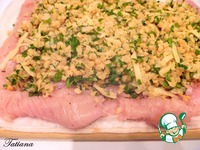 Пласт индейки поместите на пищевую пленку, сверху посолите, поперчите, выложите чечевичную начинку. Мясо сверните туго рулетом с помощью пищевой пленки, зафиксируйте кунинарной нитью. |