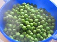 Зелёный горошек бланшировать в кипящей подсоленной воде 4 минуты и затем откинуть на дуршлаг. |