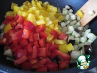 Добавьте перец и обжарьте еще 4 минуты. По истечении времени налейте белое вино и потушите овощи еще 4 минуты. Начинка готова. Остудите овощи. |