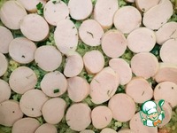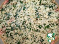 Отварной картофель смешиваем с мелко рубленой зеленью и тщательно разминаем вилкой. Солим-перчим. Выкладываем слой на тесто. |