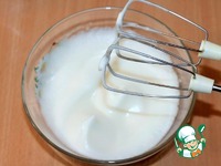 Охлажденные белки взбиваем с маленькой щепоткой соли. Постепенно всыпаем мелкий сахар (60 г) и взбиваем до твердых пиков. |