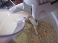 В посуду выложить сметану, постепенно добавляя теплую воду, довести объем жидкости до 600 мл., муку просеять в чашу комбайна вместе с разрыхлителем, добавить соль, сахар. |