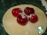 Берем один кружочек (основу), кладем 3-4 вишни, посыпаем сверху сахаром и формируем вареник. |