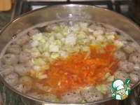 В кипящий бульон опустить картофель, довести до кипения и посолить. Добавить промытую крупу и снова довести до кипения. Убавить огонь и при слабом кипении аккуратно опустить в суп фрикадельки |