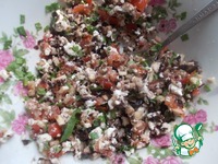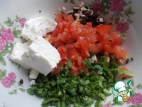 Ножки грибов порезать, затем порезать помидоры (без семян) и шпинат. Добавить творог и соль. |