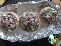 Плотно нафаршировать грибы. Уложить на смазанный маслом противень или фольгу и отправить в разогретую духовку 180С на пол часика. Приятного аппетита! |