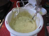 Кефир вылить в чашу комбайна, всыпать разрыхлитель, соль, сахар все размешать. Добавить яйца. |