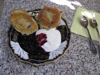 Готовила на завтрак. Подала со сметаной и черничным вареньем. |