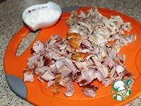 Куриное мясо (отварное и копченое) нарезаем небольшими кусками. рядом с мясом примостилась мука. |