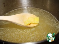 Одновременно отвариваем картофель до полуготовности в курином бульоне (приблизительно стакан бульона отливаем и отставляем). |